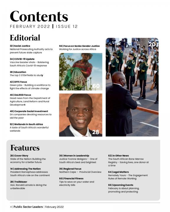senior leaders in public service and the public sector in general, Public Sector Leaders speaks to an audience with the highest level of authority - government decision-makers. With a digital readership of 40 000 monthly, Public Sector Leader is the only specialised platform that offers a window of opportunity for marketers and communicators in both the public and private sectors to engage with an audience of senior government officials. As a group, this audience presides over a procurement budget of more than R150 billion per annum and their requirement list includes both products and services from the corporate sector. Their procurement decisions range from acquiring technology solutions, legal services, performance tools, audit services, communication solutions, catering services, security, office equipment, buildings and facilities, environmental products, waste-management solutions and general products. The Purpose of the Brand: Celebrating and showcasing trusted ethical and best practice in the public sector to an African & global audience - highlighting innovation, policy making and community initiatives Shining an independent light on what public servants are doing Our goal is to start in South Africa and grow into Africa
