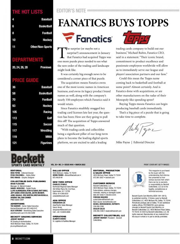 Beckett Sports Card Monthly is a monthly magazine loaded with everything you need to know about new all sports, non-sports, gaming cards and more. It offers news, values for new releases as well as past sets along with the latest collecting trends. Our readers use this magazine to find out what's new, what their cards are worth, who's hot, who's not and more. For veterans and novices, Beckett Sports Card Monthly is a must-have resource to stay informed and aware of the hobby. What to expect in each issue: • Editorial coverage: A mix of news, features and opinion pieces covering what’s new and what’s interesting in the hobby along with insight on how and what to collect. • Previews: All you need to know about upcoming card sets. • Reviews: Breakdowns and opinions of the newest card releases. • The Hot List: A visual list and values for the 20 hottest cards on the market. • The Price Guide: More than 200 pages filled with price ranges for new releases and past sets. • Market Watch: A look at the key players and products to collect.