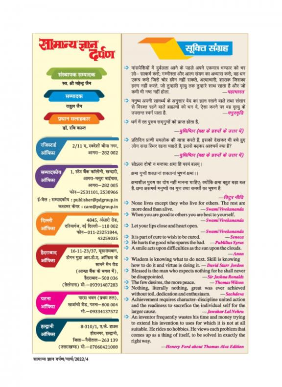 Samanya Gyan Darpan is a Hindi magazine that provides information on general knowledge, history, geography, science, and other topics. The magazine was first published in 1980 and is still one of the most popular general knowledge magazines in India. Samanya Gyan Darpan features a variety of articles each month, including: * General knowledge questions: This section asks general knowledge questions on a variety of topics. * Subject-based articles: This section publishes informative articles on a particular subject. * Special issues: This section publishes special issues on a particular topic, such as history, geography, science, or others. Samanya Gyan Darpan is a valuable resource for students, competitive exam aspirants, and the educated public in general. The magazine can help you learn about the world and increase your knowledge.