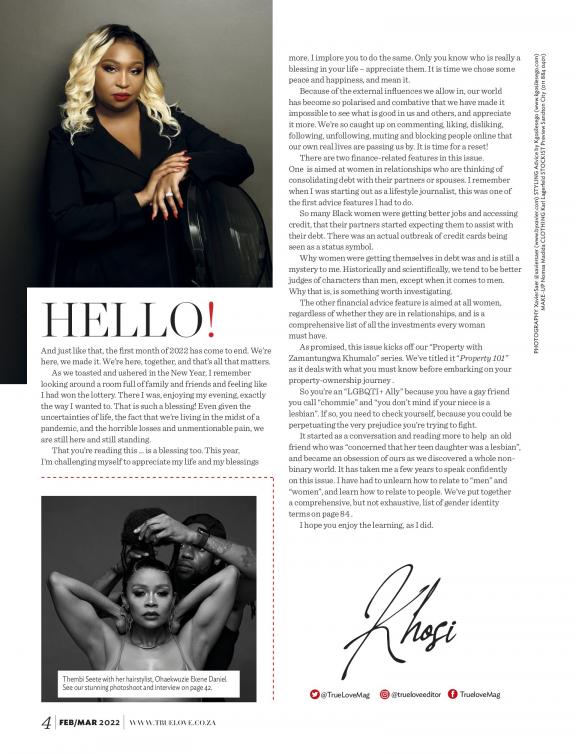 True Love is the iconic South African fashion, beauty and lifestyle magazine for black women. It is the go-to handbook and style guide for women who believe that their magazine should be stylish and thought provoking. It challenges its readers with in depth, focusing on subjects that stimulate debate and discussion.