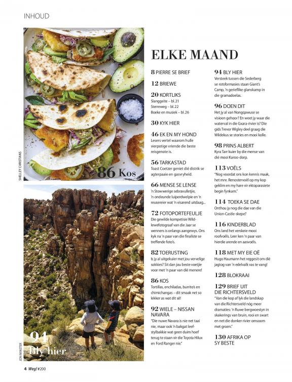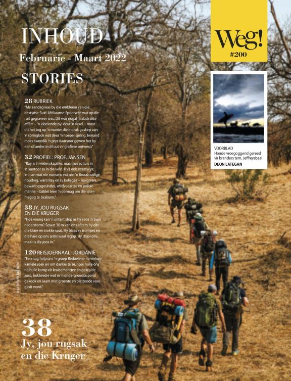 Suid-Afrika se voorste reistydskrif is enige buitelewemens se paspoort tot bekostigbare bestemmings en blyplek in Suidelike-Afrika. Elke uitgawe is volgepak met puik foto’s en gesaghebbende stories oor interessante mense en plekke (en wat om daar te doen). Kamp, voetslaan, fotografie, toerusting, kos, die langpad, en avontuur is ook deel van Weg se DNS. En omdat ons nie freebies aanvaar nie en self vir alles betaal, weet lesers hulle kan ons inligting vertrou. Of jy wil wegbreek vir die naweek of ’n lang vakansie, jou reis begin hier...