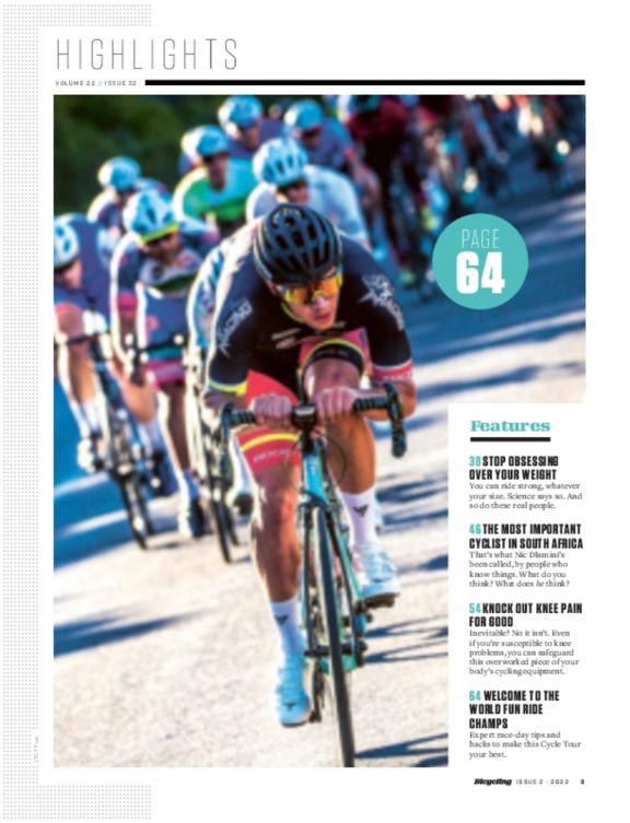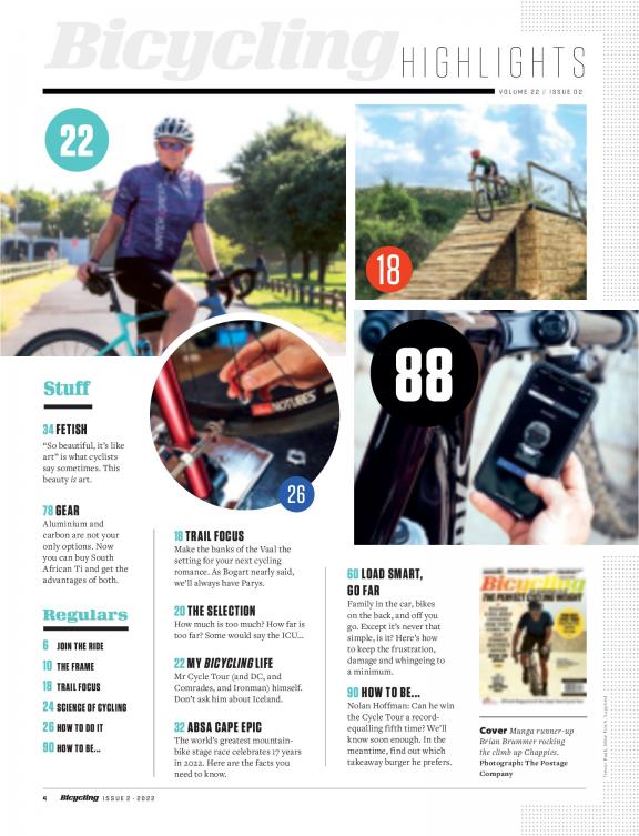 Bicycling is South Africa's leading cycling magazine and is aimed at both road and mountain biking enthusiasts. Launched in February 2003, it is published 10 times a year, targeting the fast-growing and affluent lifestyle cycling market youngsters, adults, professional as well as casual cyclists. The magazine is filled with the best international and local content for every element of the cyclist's life from training techniques and fitness information to inspiring human interest stories, event news, nutrition and motivation. Bicycling is also South Africa's leading tester of bikes and gear with over 30% of the monthly magazine dedicated to the latest reviews so our readers can make the best choices.
