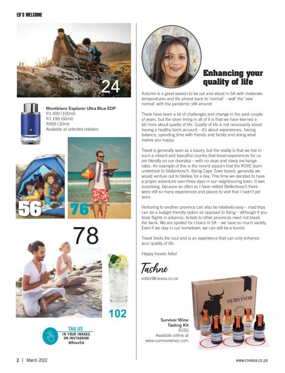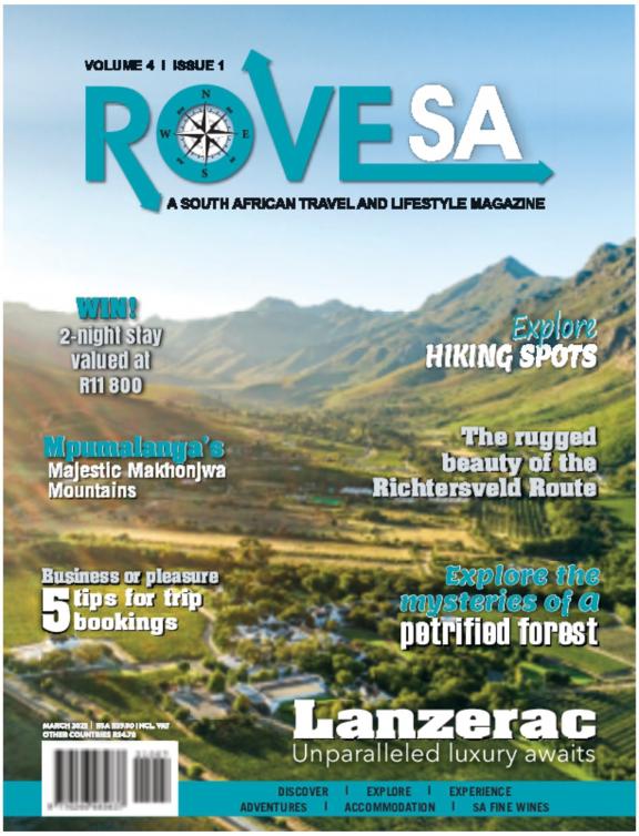 Rove SA is a useful and easy-to-use tourist guide for local and international travellers that is published in a hard copy and online format. Its editorial focus is driven by reviews of accommodation, adventure, dining, travel, and so much more. Rove SA is designed as a guide for tourists to explore the beauty South Africa has to offer and we encourage our readers to gain a first-hand experience of our country by following our trusted recommendations. Print frequency: Autumn – March to May Winter – June to August Spring – September – November Summer – December to February