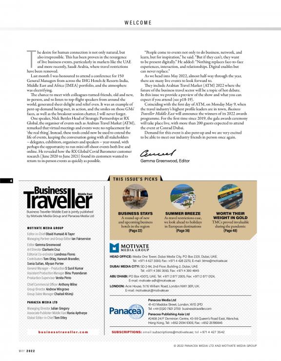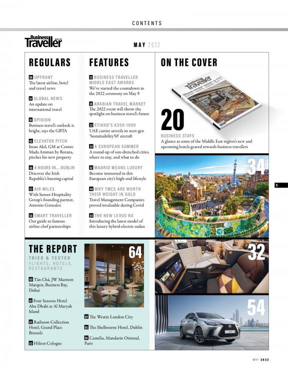 Business Traveller Middle East is the leading magazine for the corporate traveller. We aim to save you money and make your travelling life easier. Each edition has the latest news covering airlines, airports, hotels and car hire companies, regional and international destination features and updates on gadgets, technology and accessories.