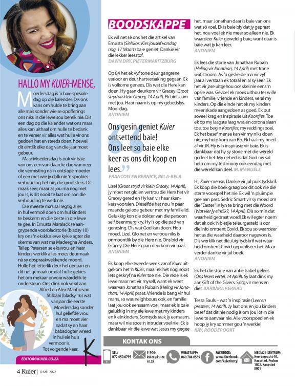 Kuier gee raad oor alles van ouerskap, geldsake, verhoudings en gesondheid tot mode, skoonheid, dekor en kos. Die tydskrif deel inspirerende stories oor mense in die gemeenskap en streef daarna om lesers op te hef en te bemagtig deur die klem te plaas op positiewe stories en suksesvolle rolmodelle. Die projekte is grootliks gemeenskapgebaseerd, met die visie om waarlik ’n verskil in lesers se lewens te maak.