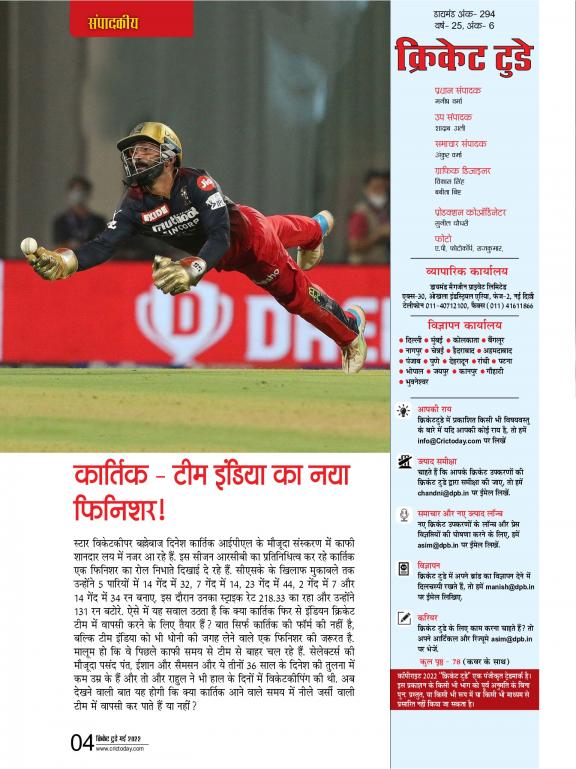Cricket Today is a monthly cricket magazine in Hindi published by a Delhi-based company, Diamond Magazines. It is one of the most popular cricket magazines in India, and is known for its in-depth coverage of all aspects of the game, including: * Match reports and analysis: Cricket Today provides detailed match reports and analysis of all major cricket matches, including Test matches, One-Day Internationals, and T20 Internationals. The magazine also covers domestic cricket tournaments in India, such as the Ranji Trophy and the Indian Premier League. * Player profiles and interviews: Cricket Today features profiles of top cricket players from India and around the world, as well as interviews with them. These profiles and interviews provide readers with insights into the lives and careers of these players. * Expert columns and commentary: Cricket Today features columns and commentary from leading cricket experts, including former players, coaches, and journalists. These columns and commentary provide readers with different perspectives on the game. * Cricket news and trends: Cricket Today covers the latest cricket news and trends from India and around the world. The magazine also provides analysis of the latest developments in the game. Cricket Today is a valuable resource for anyone who is interested in cricket. It is a must-read for anyone who is looking to stay informed about the latest cricket news and trends, or who is looking for in-depth coverage of all aspects of the game.