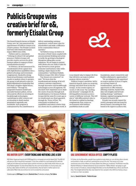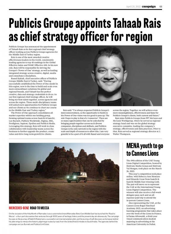 Campaign ME is the Middle East edition of the UK’s leading magazine for the advertising and media industry. Our aim is to champion creativity and best practice and to act as a constructive forum for debate in the midst of an ever-evolving media landscape.