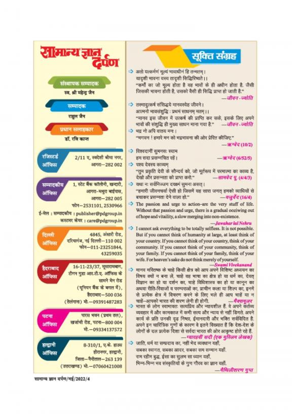 Samanya Gyan Darpan is a Hindi magazine that provides information on general knowledge, history, geography, science, and other topics. The magazine was first published in 1980 and is still one of the most popular general knowledge magazines in India. Samanya Gyan Darpan features a variety of articles each month, including: * General knowledge questions: This section asks general knowledge questions on a variety of topics. * Subject-based articles: This section publishes informative articles on a particular subject. * Special issues: This section publishes special issues on a particular topic, such as history, geography, science, or others. Samanya Gyan Darpan is a valuable resource for students, competitive exam aspirants, and the educated public in general. The magazine can help you learn about the world and increase your knowledge.