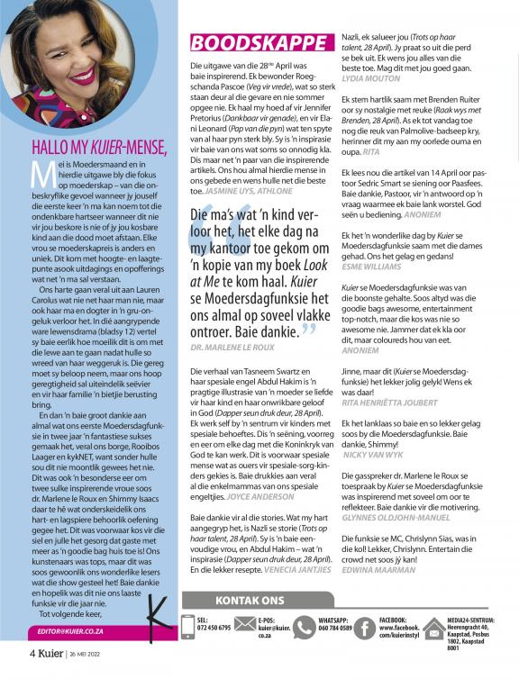 Kuier gee raad oor alles van ouerskap, geldsake, verhoudings en gesondheid tot mode, skoonheid, dekor en kos. Die tydskrif deel inspirerende stories oor mense in die gemeenskap en streef daarna om lesers op te hef en te bemagtig deur die klem te plaas op positiewe stories en suksesvolle rolmodelle. Die projekte is grootliks gemeenskapgebaseerd, met die visie om waarlik ’n verskil in lesers se lewens te maak.
