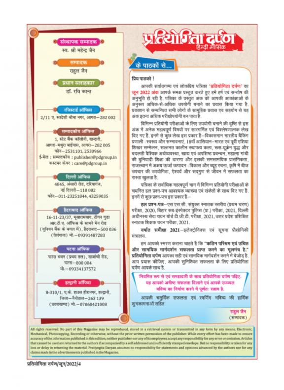 Pratiyogita Darpan Hindi Magazine is a popular Hindi-language magazine for students preparing for competitive exams in India. The magazine covers a wide range of topics, including general knowledge, history, geography, science, mathematics, and more, to help students build a strong foundation in these subjects. The magazine also includes analysis of previous years' question papers to help students understand the exam pattern and types of questions. Here are some of the features of Pratiyogita Darpan Hindi Magazine: * Comprehensive coverage: The magazine covers a wide range of topics in a comprehensive manner. * Detailed analysis: The magazine also includes analysis of previous years' question papers to help students understand the exam pattern and types of questions. * Easy to understand: The content in the magazine is presented in a simple and easy-to-understand manner. * Practice questions: The magazine also includes practice questions to help students evaluate their preparation and improve their skills. Pratiyogita Darpan Hindi Magazine is a valuable resource for students preparing for competitive exams in India. The magazine provides students with the knowledge and skills they need to succeed in these exams.