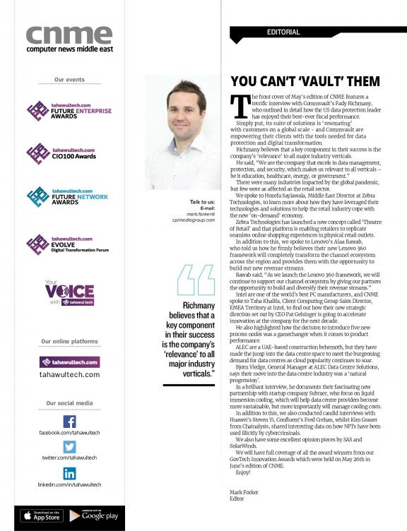 For any serious IT player in the Middle East, there are key market sectors that are easy to list – government, energy, banking, education, health, hospitality and so on. One key question is how do you use your marketing spend effectively to reach and influence the key decision makers in these markets? Plan and influence their strategies? For two decades, Computer News Middle East (CNME) has been the link between the regional IT player and these key target markets. It has driven the messages of local relevance, business benefit and technology into focus for these decision makers. The magazine covers all the important market sectors in depth, combining interviews, best practice case studies, news analysis and market trends through focused sections. Add to this analysis of global news, exclusive interviews with global IT players from Silicon Valley to Taipei and you have an authoritative route to market.