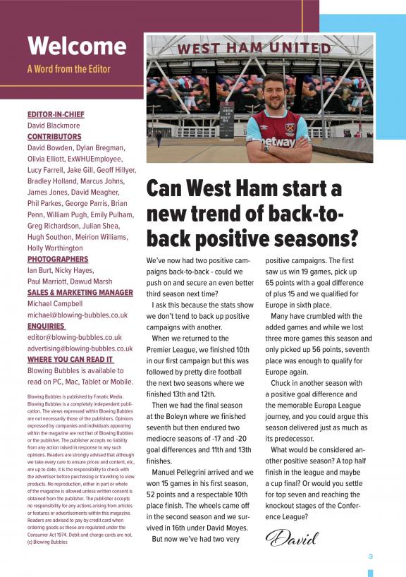 The biggest West Ham United monthly magazine, Blowing Bubbles is edited by a team of journalists and aims to inform, entertain and unite West Ham fans across the globe with our easy-to-read, well-designed & professional magazine. You can have a hard copy of every issue of Blowing Bubbles posted through your door, visit our website for details.