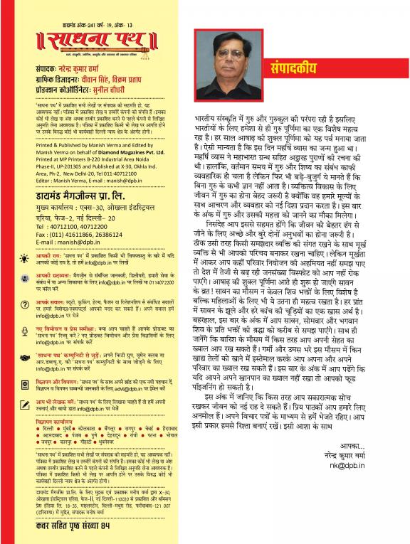 Sadhna Path is a health and wellness magazine which also covers spirituality and ayurveda in collaboration with Sadhna Channel. Sadhna Path is an endeavour taken under the aegis of Diamond magazines, to make discerning and callous people stop aping the West blindly and realise their country's worth. It is a monthly Hindi transformative magazine being published for the last eight years, covering religion, astrology, spirituality, vaastu and Feng Shui. It is a complete magazine for your mind, body and soul.