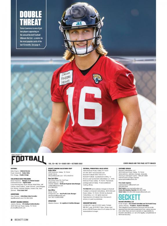 Dive into the exciting world of football collectibles and memorabilia with Beckett Football Magazine. We're thrilled to introduce you to this publication, your go-to source for all things related to football cards, collectibles, and the vibrant hobby of football memorabilia. Beckett Football Magazine, published by Beckett Collectibles LLC, is not just a magazine; it's your comprehensive guide to the world of football collectibles. As you explore the pages of Beckett Football Magazine, you'll find a world of content that caters to football collectors and fans alike: * Price Guides: Access up-to-date price guides for football cards, helping you stay informed about the value of your collectibles.