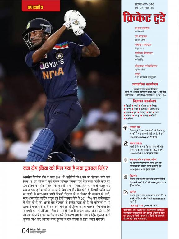 Cricket Today is a monthly cricket magazine in Hindi published by a Delhi-based company, Diamond Magazines. It is one of the most popular cricket magazines in India, and is known for its in-depth coverage of all aspects of the game, including: * Match reports and analysis: Cricket Today provides detailed match reports and analysis of all major cricket matches, including Test matches, One-Day Internationals, and T20 Internationals. The magazine also covers domestic cricket tournaments in India, such as the Ranji Trophy and the Indian Premier League. * Player profiles and interviews: Cricket Today features profiles of top cricket players from India and around the world, as well as interviews with them. These profiles and interviews provide readers with insights into the lives and careers of these players. * Expert columns and commentary: Cricket Today features columns and commentary from leading cricket experts, including former players, coaches, and journalists. These columns and commentary provide readers with different perspectives on the game. * Cricket news and trends: Cricket Today covers the latest cricket news and trends from India and around the world. The magazine also provides analysis of the latest developments in the game. Cricket Today is a valuable resource for anyone who is interested in cricket. It is a must-read for anyone who is looking to stay informed about the latest cricket news and trends, or who is looking for in-depth coverage of all aspects of the game.