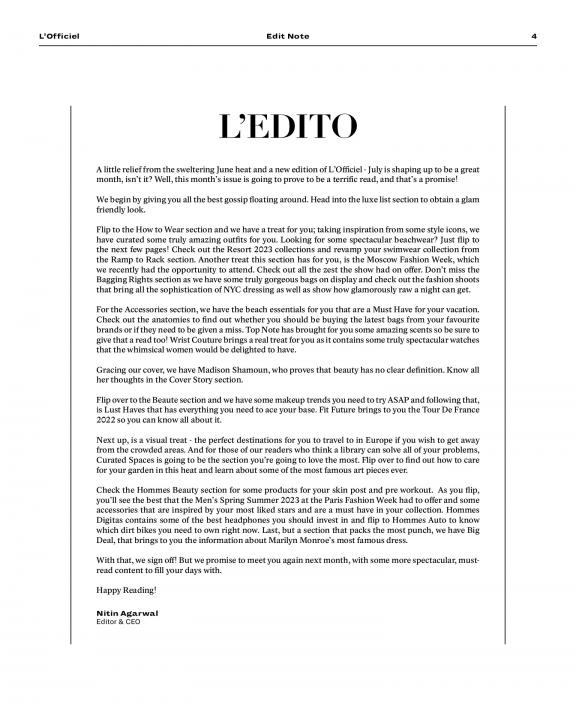 L'Officiel India is a fashion magazine published in India by TCG Media Limited. It is a part of the international L'Officiel magazine group, which has editions in over 30 countries. L'Officiel India was launched in 2006 and is published monthly. It covers fashion, beauty, lifestyle, and culture. The magazine features interviews with fashion designers, models, and celebrities, as well as editorials, features, and news. L'Officiel India is aimed at a sophisticated and discerning audience. It is known for its high-quality photography and editorial content. The magazine is a popular choice for fashion enthusiasts in India. Here are some of the features of L'Officiel India: * Fashion: L'Officiel India features the latest trends in fashion from India and around the world. It covers runway shows, designer collections, and street style. * Beauty: L'Officiel India covers the latest beauty trends and products. It features interviews with beauty experts, makeup tutorials, and skincare advice. * Lifestyle: L'Officiel India covers a variety of lifestyle topics, including travel, food, and culture. It features interviews with celebrities, travel guides, and recipes. * Culture: L'Officiel India covers the latest in art, music, and literature. It features interviews with artists, music reviews, and book excerpts. If you are interested in fashion, beauty, lifestyle, or culture, then L'Officiel India is a must-read. It is the best source of information on the latest trends and insights in these areas.