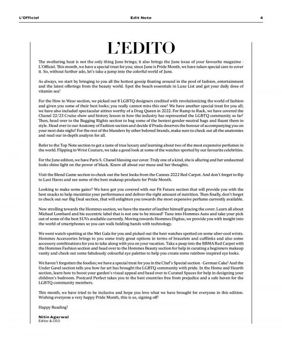 L'Officiel India is a fashion magazine published in India by TCG Media Limited. It is a part of the international L'Officiel magazine group, which has editions in over 30 countries. L'Officiel India was launched in 2006 and is published monthly. It covers fashion, beauty, lifestyle, and culture. The magazine features interviews with fashion designers, models, and celebrities, as well as editorials, features, and news. L'Officiel India is aimed at a sophisticated and discerning audience. It is known for its high-quality photography and editorial content. The magazine is a popular choice for fashion enthusiasts in India. Here are some of the features of L'Officiel India: * Fashion: L'Officiel India features the latest trends in fashion from India and around the world. It covers runway shows, designer collections, and street style. * Beauty: L'Officiel India covers the latest beauty trends and products. It features interviews with beauty experts, makeup tutorials, and skincare advice. * Lifestyle: L'Officiel India covers a variety of lifestyle topics, including travel, food, and culture. It features interviews with celebrities, travel guides, and recipes. * Culture: L'Officiel India covers the latest in art, music, and literature. It features interviews with artists, music reviews, and book excerpts. If you are interested in fashion, beauty, lifestyle, or culture, then L'Officiel India is a must-read. It is the best source of information on the latest trends and insights in these areas.