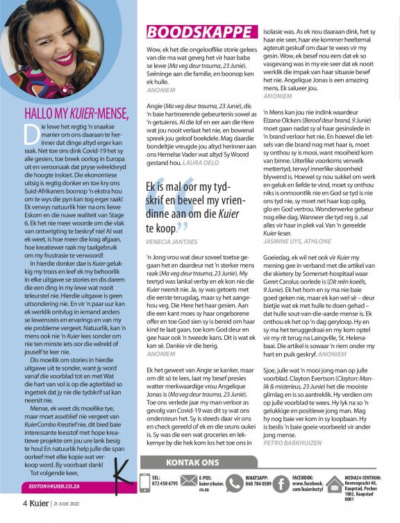 Kuier gee raad oor alles van ouerskap, geldsake, verhoudings en gesondheid tot mode, skoonheid, dekor en kos. Die tydskrif deel inspirerende stories oor mense in die gemeenskap en streef daarna om lesers op te hef en te bemagtig deur die klem te plaas op positiewe stories en suksesvolle rolmodelle. Die projekte is grootliks gemeenskapgebaseerd, met die visie om waarlik ’n verskil in lesers se lewens te maak.