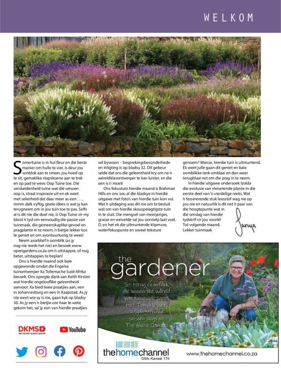 Die Tuinier Tydskrif is daaraan toegewy om tuiniers te inspireer deur praktiese raad te gee en tuinprojekte stap vir stap te wys. Ons maandartikels sluit in tuinontwerp, diepteplantartikels, die kweek van groente en kruie, watertuinmaak, tuinwildlewe en troeteldiere, spesialisplantartikels en veel meer.