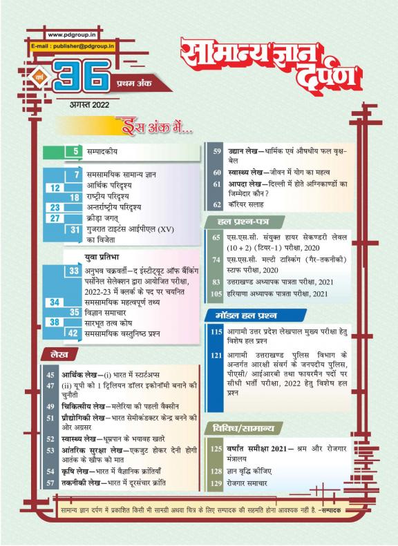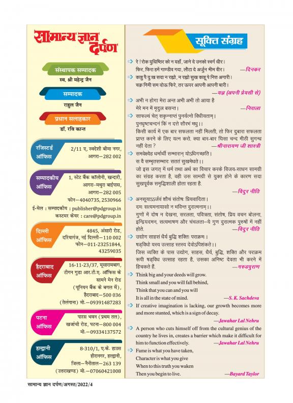 Samanya Gyan Darpan is a Hindi magazine that provides information on general knowledge, history, geography, science, and other topics. The magazine was first published in 1980 and is still one of the most popular general knowledge magazines in India. Samanya Gyan Darpan features a variety of articles each month, including: * General knowledge questions: This section asks general knowledge questions on a variety of topics. * Subject-based articles: This section publishes informative articles on a particular subject. * Special issues: This section publishes special issues on a particular topic, such as history, geography, science, or others. Samanya Gyan Darpan is a valuable resource for students, competitive exam aspirants, and the educated public in general. The magazine can help you learn about the world and increase your knowledge.