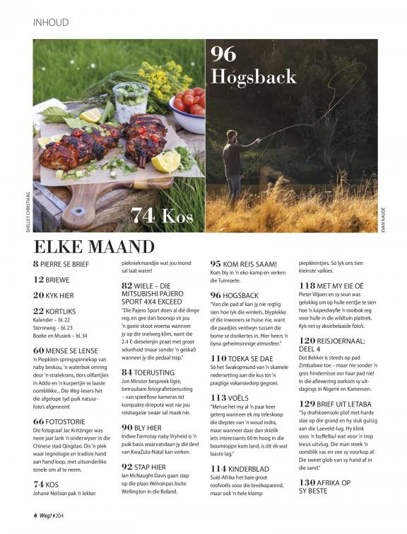 Suid-Afrika se voorste reistydskrif is enige buitelewemens se paspoort tot bekostigbare bestemmings en blyplek in Suidelike-Afrika. Elke uitgawe is volgepak met puik foto’s en gesaghebbende stories oor interessante mense en plekke (en wat om daar te doen). Kamp, voetslaan, fotografie, toerusting, kos, die langpad, en avontuur is ook deel van Weg se DNS. En omdat ons nie freebies aanvaar nie en self vir alles betaal, weet lesers hulle kan ons inligting vertrou. Of jy wil wegbreek vir die naweek of ’n lang vakansie, jou reis begin hier...