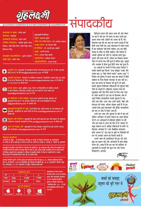 Grahlaxmi is the fastest growing women's monthly in Hindi and it perfectly fits into the framework of a contemporary woman's complete magazine under the flagship of Diamond Magazine Pvt Ltd, New Delhi. Our magazine is a right mix of content for all age groups of women. With articles ranging from sensitive issues to fun frolic and the latest in Bollywood, it offers content for all to read. Our columns on Women social awareness, Money matters, Career, Teen Funda, and Celebrity Couple are amongst few which are extremely popular with the younger genre of readers. Other interesting columns include articles on Beauty, Cookery, Humour and of course stories, to name a few. Our magazine is a collection of rich comprehensive diverse content. Though we have a wellequipped team of journalists with us, we get varied and specific inputs from the leaders in each category. Our panel of celebrities includes names like Saakshi Tanwar (who contributes to our Grehlakshmi Cares column), Apra Mehta, advises our reader on family matters. We have Sanjeev Kapoor's Khana Khazana, Ashok Chakradhar's humour. Apart from this we have well known names like Shahnaz Hussain, Blossom Kochar, Sanjay Chugh, Dr.Sunny Bakshi, Vimla Patil, Neeta Raheja, Javed Habib, Chaitanya Kirti, Dr. Kiran Bedi, Neeta Mehta, Manish Arora, Aparna Chandra, Dr. Shyama Choma and Vandana Luthra, who are also a part of our panel.