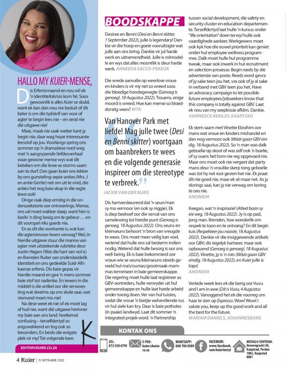 Kuier gee raad oor alles van ouerskap, geldsake, verhoudings en gesondheid tot mode, skoonheid, dekor en kos. Die tydskrif deel inspirerende stories oor mense in die gemeenskap en streef daarna om lesers op te hef en te bemagtig deur die klem te plaas op positiewe stories en suksesvolle rolmodelle. Die projekte is grootliks gemeenskapgebaseerd, met die visie om waarlik ’n verskil in lesers se lewens te maak.