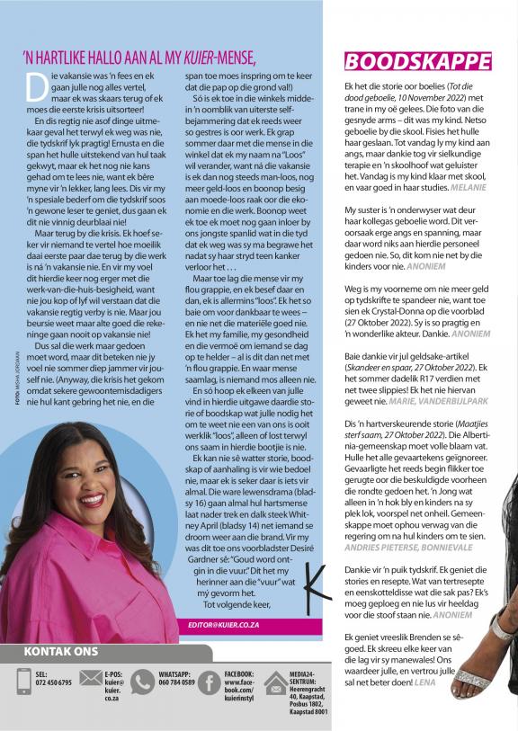 Kuier gee raad oor alles van ouerskap, geldsake, verhoudings en gesondheid tot mode, skoonheid, dekor en kos. Die tydskrif deel inspirerende stories oor mense in die gemeenskap en streef daarna om lesers op te hef en te bemagtig deur die klem te plaas op positiewe stories en suksesvolle rolmodelle. Die projekte is grootliks gemeenskapgebaseerd, met die visie om waarlik ’n verskil in lesers se lewens te maak.