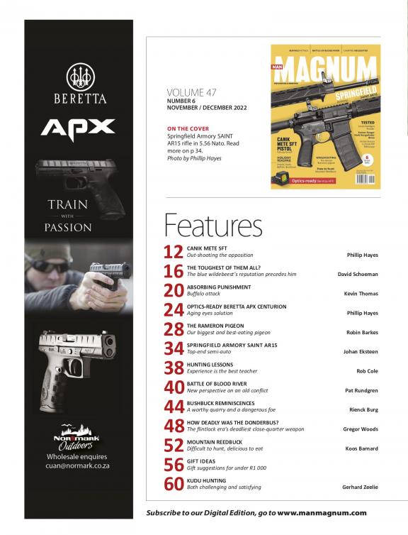 Magnum has a longstanding, worldwide reputation for its authoritative, informative and entertaining features on rifles, shotguns, handguns, black powder firearms, hunting, wing-shooting, hand-loading, African wildlife, history and adventure. Staffed by experts who “tell it as it is”. For the hunter and shooter, Magnum has it all.