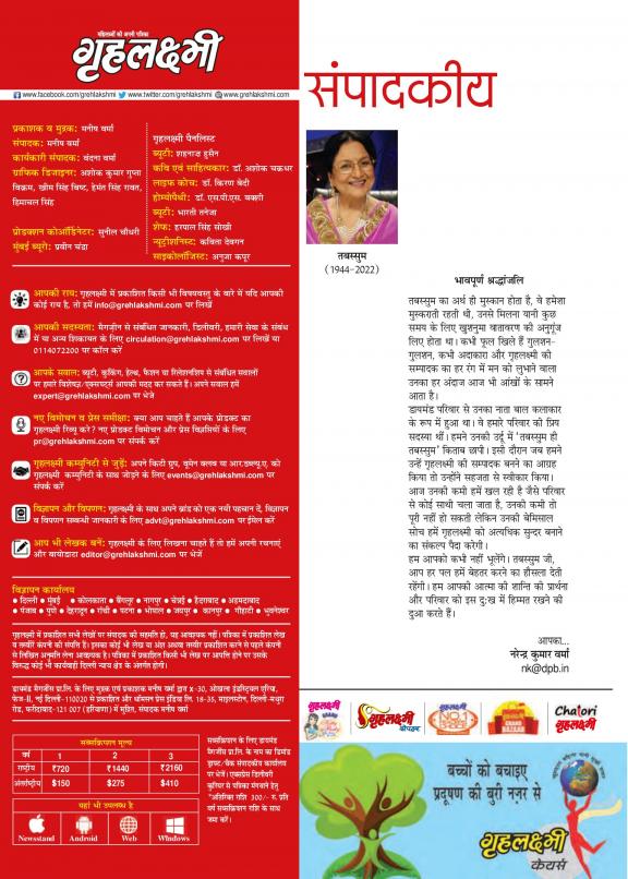 Grahlaxmi is the fastest growing women's monthly in Hindi and it perfectly fits into the framework of a contemporary woman's complete magazine under the flagship of Diamond Magazine Pvt Ltd, New Delhi. Our magazine is a right mix of content for all age groups of women. With articles ranging from sensitive issues to fun frolic and the latest in Bollywood, it offers content for all to read. Our columns on Women social awareness, Money matters, Career, Teen Funda, and Celebrity Couple are amongst few which are extremely popular with the younger genre of readers. Other interesting columns include articles on Beauty, Cookery, Humour and of course stories, to name a few. Our magazine is a collection of rich comprehensive diverse content. Though we have a wellequipped team of journalists with us, we get varied and specific inputs from the leaders in each category. Our panel of celebrities includes names like Saakshi Tanwar (who contributes to our Grehlakshmi Cares column), Apra Mehta, advises our reader on family matters. We have Sanjeev Kapoor's Khana Khazana, Ashok Chakradhar's humour. Apart from this we have well known names like Shahnaz Hussain, Blossom Kochar, Sanjay Chugh, Dr.Sunny Bakshi, Vimla Patil, Neeta Raheja, Javed Habib, Chaitanya Kirti, Dr. Kiran Bedi, Neeta Mehta, Manish Arora, Aparna Chandra, Dr. Shyama Choma and Vandana Luthra, who are also a part of our panel.