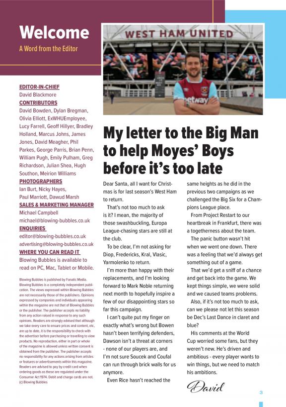 The biggest West Ham United monthly magazine, Blowing Bubbles is edited by a team of journalists and aims to inform, entertain and unite West Ham fans across the globe with our easy-to-read, well-designed & professional magazine. You can have a hard copy of every issue of Blowing Bubbles posted through your door, visit our website for details.