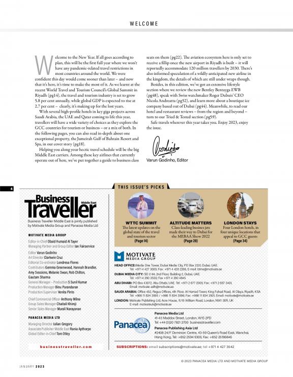 Business Traveller Middle East is the leading magazine for the corporate traveller. We aim to save you money and make your travelling life easier. Each edition has the latest news covering airlines, airports, hotels and car hire companies, regional and international destination features and updates on gadgets, technology and accessories.
