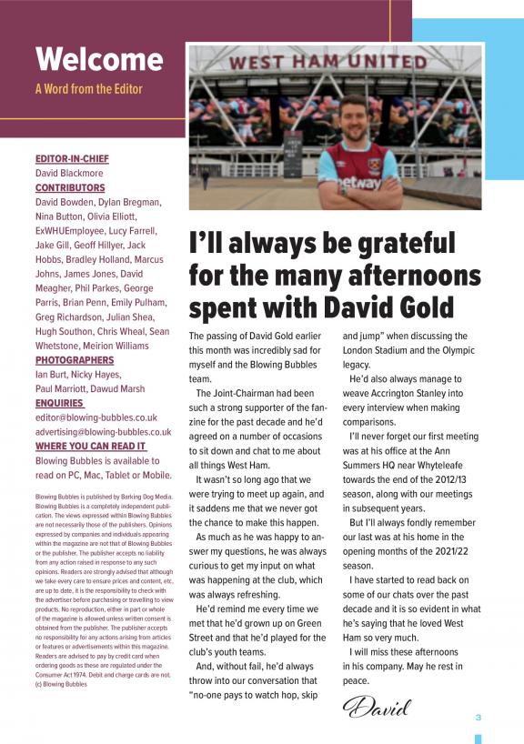 The biggest West Ham United monthly magazine, Blowing Bubbles is edited by a team of journalists and aims to inform, entertain and unite West Ham fans across the globe with our easy-to-read, well-designed & professional magazine. You can have a hard copy of every issue of Blowing Bubbles posted through your door, visit our website for details.