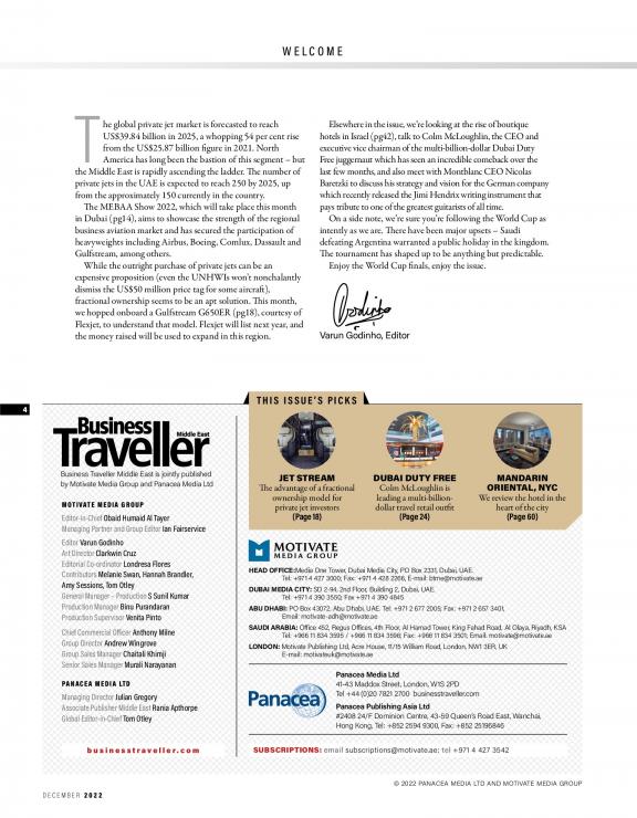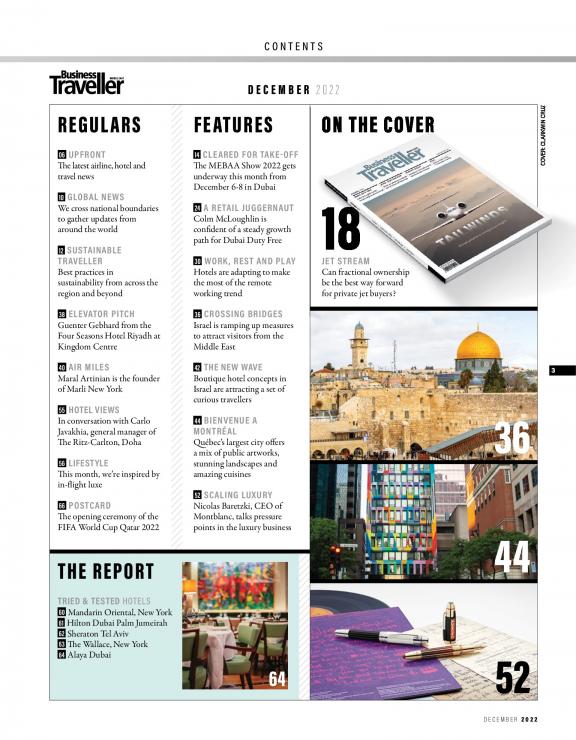 Business Traveller Middle East is the leading magazine for the corporate traveller. We aim to save you money and make your travelling life easier. Each edition has the latest news covering airlines, airports, hotels and car hire companies, regional and international destination features and updates on gadgets, technology and accessories.