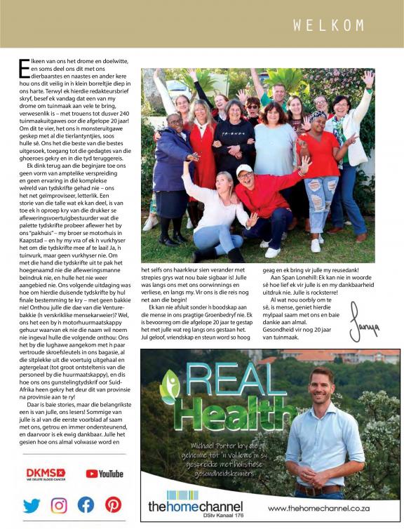 Die Tuinier Tydskrif is daaraan toegewy om tuiniers te inspireer deur praktiese raad te gee en tuinprojekte stap vir stap te wys. Ons maandartikels sluit in tuinontwerp, diepteplantartikels, die kweek van groente en kruie, watertuinmaak, tuinwildlewe en troeteldiere, spesialisplantartikels en veel meer.