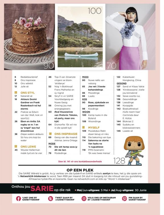 SARIE is die voorkeur-glanstydskrif van die Afrikaanssprekende vrou van Suid-Afrika met ‘n moderne wêreldbeskouiing. SARIE is ‘n intieme deel van haar lewe en ‘n ware voortsetting van haar leefstyl. Maand ná maand vertel die tydskrif tipies Suid-Afrikaanse stories wat haar altyd goed laat voel oor haarself en haar wêreld. Dis na SARIE dat sy haar wend vir kernoplossings en vertroude geselsies. Dis waar sy haar spesiale inspirasie vind.