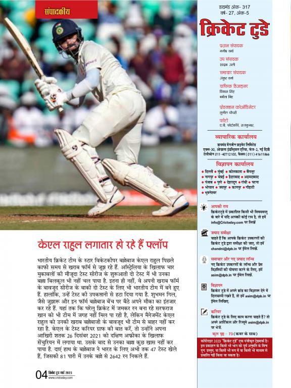 Cricket Today is a monthly cricket magazine in Hindi published by a Delhi-based company, Diamond Magazines. It is one of the most popular cricket magazines in India, and is known for its in-depth coverage of all aspects of the game, including: * Match reports and analysis: Cricket Today provides detailed match reports and analysis of all major cricket matches, including Test matches, One-Day Internationals, and T20 Internationals. The magazine also covers domestic cricket tournaments in India, such as the Ranji Trophy and the Indian Premier League. * Player profiles and interviews: Cricket Today features profiles of top cricket players from India and around the world, as well as interviews with them. These profiles and interviews provide readers with insights into the lives and careers of these players. * Expert columns and commentary: Cricket Today features columns and commentary from leading cricket experts, including former players, coaches, and journalists. These columns and commentary provide readers with different perspectives on the game. * Cricket news and trends: Cricket Today covers the latest cricket news and trends from India and around the world. The magazine also provides analysis of the latest developments in the game. Cricket Today is a valuable resource for anyone who is interested in cricket. It is a must-read for anyone who is looking to stay informed about the latest cricket news and trends, or who is looking for in-depth coverage of all aspects of the game.