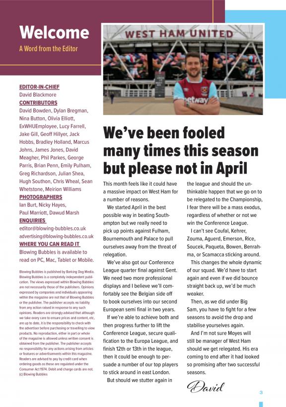 The biggest West Ham United monthly magazine, Blowing Bubbles is edited by a team of journalists and aims to inform, entertain and unite West Ham fans across the globe with our easy-to-read, well-designed & professional magazine. You can have a hard copy of every issue of Blowing Bubbles posted through your door, visit our website for details.