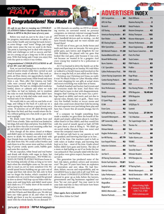 The focus of RPM is to bring a diverse mix of high performance street and race automobiles to life within its pages including: Race cars, musclecars, hot rods and street legal machines with an emphasis on the "Extreme" including Fast doorslammer and outlaw forms of Drag Racing. Not familiar with these types of cars? They are considered to be the top shelf of the industry and are on the edge with regards to design and power. Grab your copy today and check it out. We are sure you will want more!