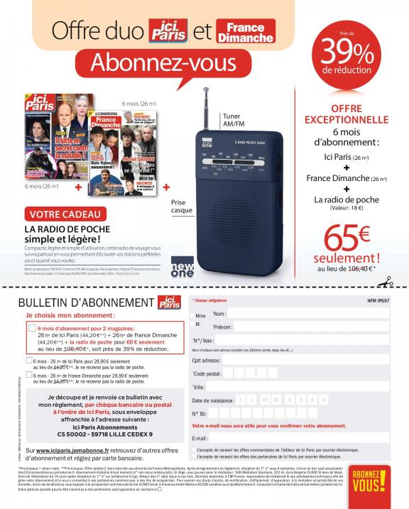 Le magazine Ici Paris vous fait partager la vie publique et privée de celles et ceux qui font l'actualité : exclusivités, interviews, enquêtes (la face cachée du showbiz, les coulisses de la télé) indiscrétions, potins.
