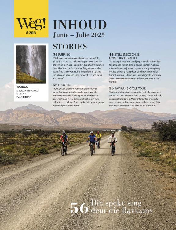 Suid-Afrika se voorste reistydskrif is enige buitelewemens se paspoort tot bekostigbare bestemmings en blyplek in Suidelike-Afrika. Elke uitgawe is volgepak met puik foto’s en gesaghebbende stories oor interessante mense en plekke (en wat om daar te doen). Kamp, voetslaan, fotografie, toerusting, kos, die langpad, en avontuur is ook deel van Weg se DNS. En omdat ons nie freebies aanvaar nie en self vir alles betaal, weet lesers hulle kan ons inligting vertrou. Of jy wil wegbreek vir die naweek of ’n lang vakansie, jou reis begin hier...