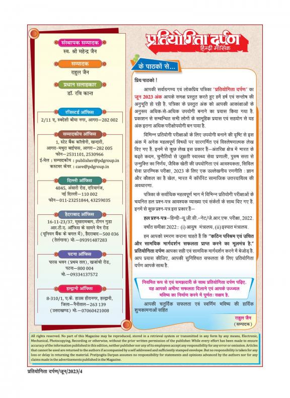 Pratiyogita Darpan Hindi Magazine is a popular Hindi-language magazine for students preparing for competitive exams in India. The magazine covers a wide range of topics, including general knowledge, history, geography, science, mathematics, and more, to help students build a strong foundation in these subjects. The magazine also includes analysis of previous years' question papers to help students understand the exam pattern and types of questions. Here are some of the features of Pratiyogita Darpan Hindi Magazine: * Comprehensive coverage: The magazine covers a wide range of topics in a comprehensive manner. * Detailed analysis: The magazine also includes analysis of previous years' question papers to help students understand the exam pattern and types of questions. * Easy to understand: The content in the magazine is presented in a simple and easy-to-understand manner. * Practice questions: The magazine also includes practice questions to help students evaluate their preparation and improve their skills. Pratiyogita Darpan Hindi Magazine is a valuable resource for students preparing for competitive exams in India. The magazine provides students with the knowledge and skills they need to succeed in these exams.