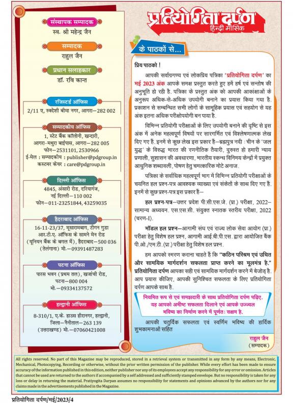 Pratiyogita Darpan Hindi Magazine is a popular Hindi-language magazine for students preparing for competitive exams in India. The magazine covers a wide range of topics, including general knowledge, history, geography, science, mathematics, and more, to help students build a strong foundation in these subjects. The magazine also includes analysis of previous years' question papers to help students understand the exam pattern and types of questions. Here are some of the features of Pratiyogita Darpan Hindi Magazine: * Comprehensive coverage: The magazine covers a wide range of topics in a comprehensive manner. * Detailed analysis: The magazine also includes analysis of previous years' question papers to help students understand the exam pattern and types of questions. * Easy to understand: The content in the magazine is presented in a simple and easy-to-understand manner. * Practice questions: The magazine also includes practice questions to help students evaluate their preparation and improve their skills. Pratiyogita Darpan Hindi Magazine is a valuable resource for students preparing for competitive exams in India. The magazine provides students with the knowledge and skills they need to succeed in these exams.
