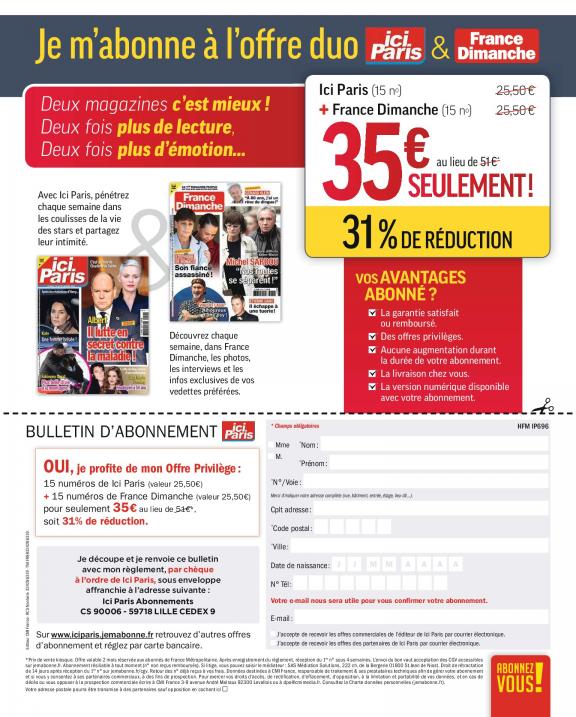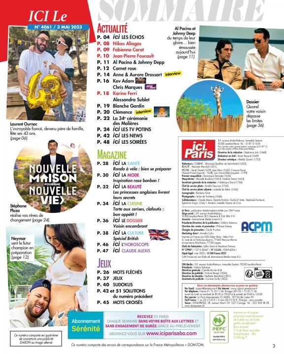 Le magazine Ici Paris vous fait partager la vie publique et privée de celles et ceux qui font l'actualité : exclusivités, interviews, enquêtes (la face cachée du showbiz, les coulisses de la télé) indiscrétions, potins.