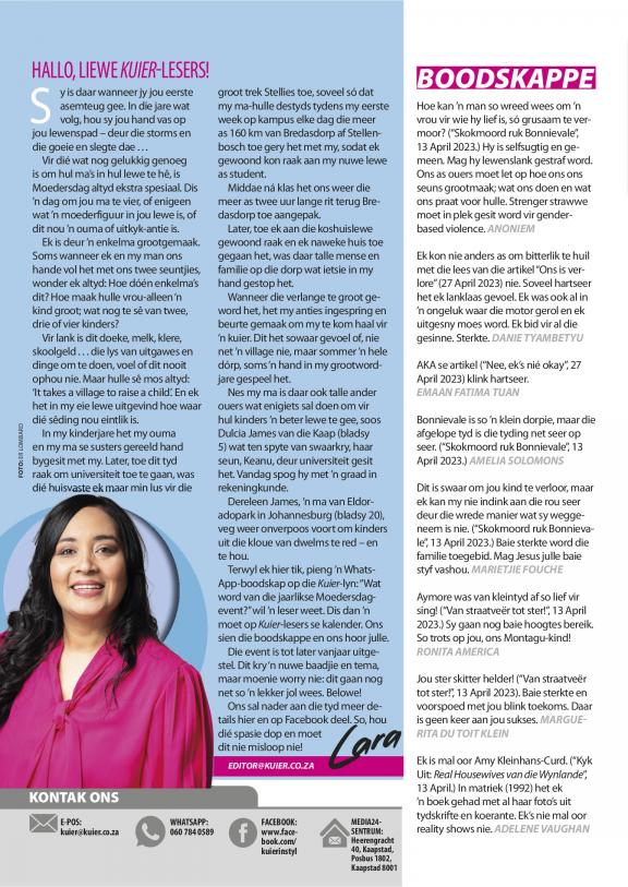 Kuier gee raad oor alles van ouerskap, geldsake, verhoudings en gesondheid tot mode, skoonheid, dekor en kos. Die tydskrif deel inspirerende stories oor mense in die gemeenskap en streef daarna om lesers op te hef en te bemagtig deur die klem te plaas op positiewe stories en suksesvolle rolmodelle. Die projekte is grootliks gemeenskapgebaseerd, met die visie om waarlik ’n verskil in lesers se lewens te maak.