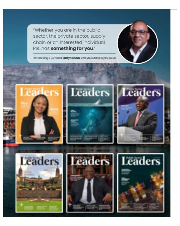senior leaders in public service and the public sector in general, Public Sector Leaders speaks to an audience with the highest level of authority - government decision-makers. With a digital readership of 40 000 monthly, Public Sector Leader is the only specialised platform that offers a window of opportunity for marketers and communicators in both the public and private sectors to engage with an audience of senior government officials. As a group, this audience presides over a procurement budget of more than R150 billion per annum and their requirement list includes both products and services from the corporate sector. Their procurement decisions range from acquiring technology solutions, legal services, performance tools, audit services, communication solutions, catering services, security, office equipment, buildings and facilities, environmental products, waste-management solutions and general products. The Purpose of the Brand: Celebrating and showcasing trusted ethical and best practice in the public sector to an African & global audience - highlighting innovation, policy making and community initiatives Shining an independent light on what public servants are doing Our goal is to start in South Africa and grow into Africa