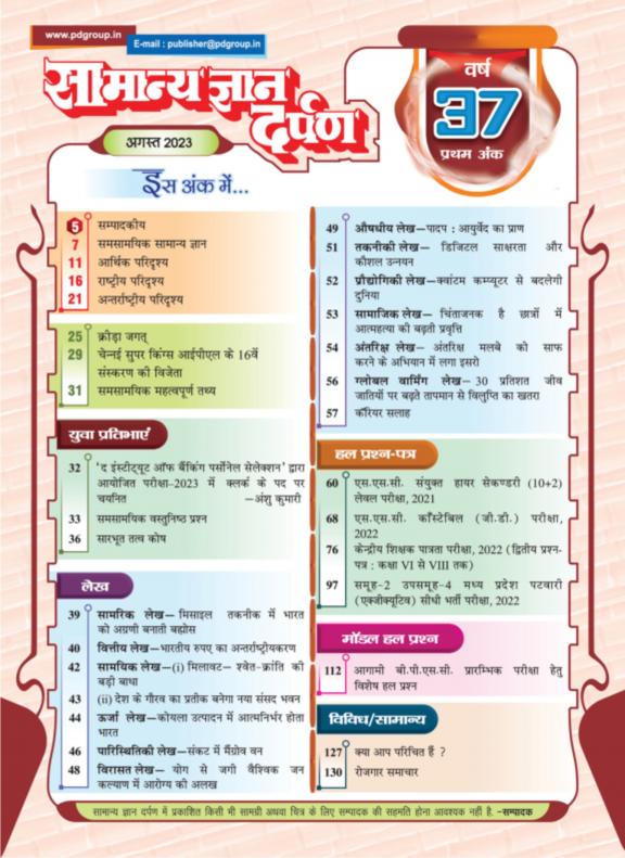 Samanya Gyan Darpan is a Hindi magazine that provides information on general knowledge, history, geography, science, and other topics. The magazine was first published in 1980 and is still one of the most popular general knowledge magazines in India. Samanya Gyan Darpan features a variety of articles each month, including: * General knowledge questions: This section asks general knowledge questions on a variety of topics. * Subject-based articles: This section publishes informative articles on a particular subject. * Special issues: This section publishes special issues on a particular topic, such as history, geography, science, or others. Samanya Gyan Darpan is a valuable resource for students, competitive exam aspirants, and the educated public in general. The magazine can help you learn about the world and increase your knowledge.