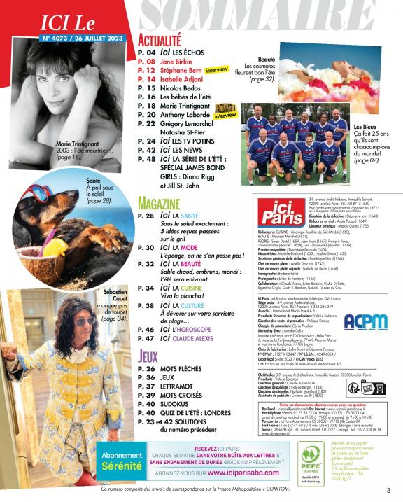 Le magazine Ici Paris vous fait partager la vie publique et privée de celles et ceux qui font l'actualité : exclusivités, interviews, enquêtes (la face cachée du showbiz, les coulisses de la télé) indiscrétions, potins.