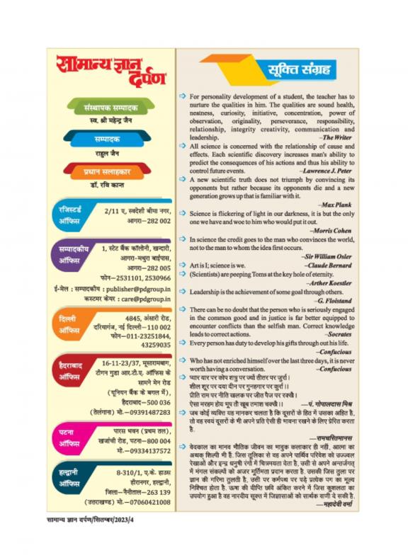 Samanya Gyan Darpan is a Hindi magazine that provides information on general knowledge, history, geography, science, and other topics. The magazine was first published in 1980 and is still one of the most popular general knowledge magazines in India. Samanya Gyan Darpan features a variety of articles each month, including: * General knowledge questions: This section asks general knowledge questions on a variety of topics. * Subject-based articles: This section publishes informative articles on a particular subject. * Special issues: This section publishes special issues on a particular topic, such as history, geography, science, or others. Samanya Gyan Darpan is a valuable resource for students, competitive exam aspirants, and the educated public in general. The magazine can help you learn about the world and increase your knowledge.