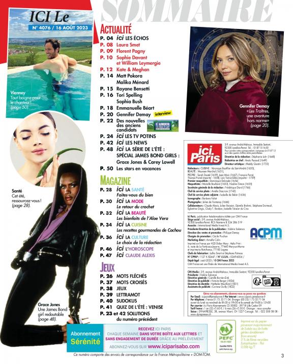 Le magazine Ici Paris vous fait partager la vie publique et privée de celles et ceux qui font l'actualité : exclusivités, interviews, enquêtes (la face cachée du showbiz, les coulisses de la télé) indiscrétions, potins.